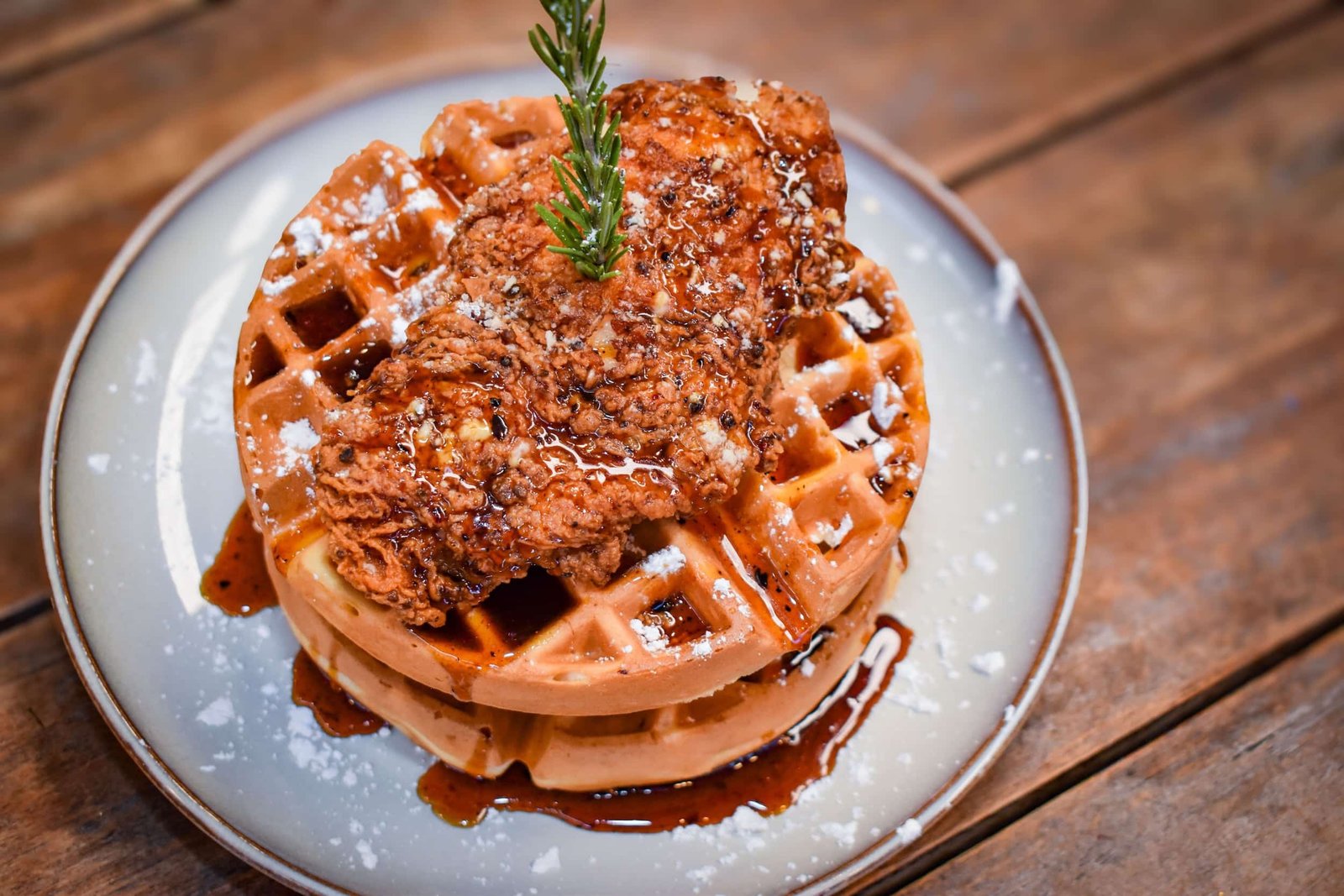 Chicken & Waffles: Hand-breaded fried chicken breast | Belgian waffles | Piloncillo-rosemary syrup