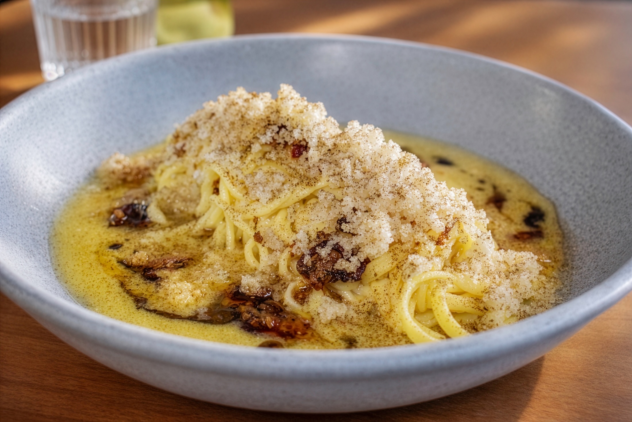 Spaghetti limon: House-made spaghetti | uni butter | nori | tempura | Italian chili crunch