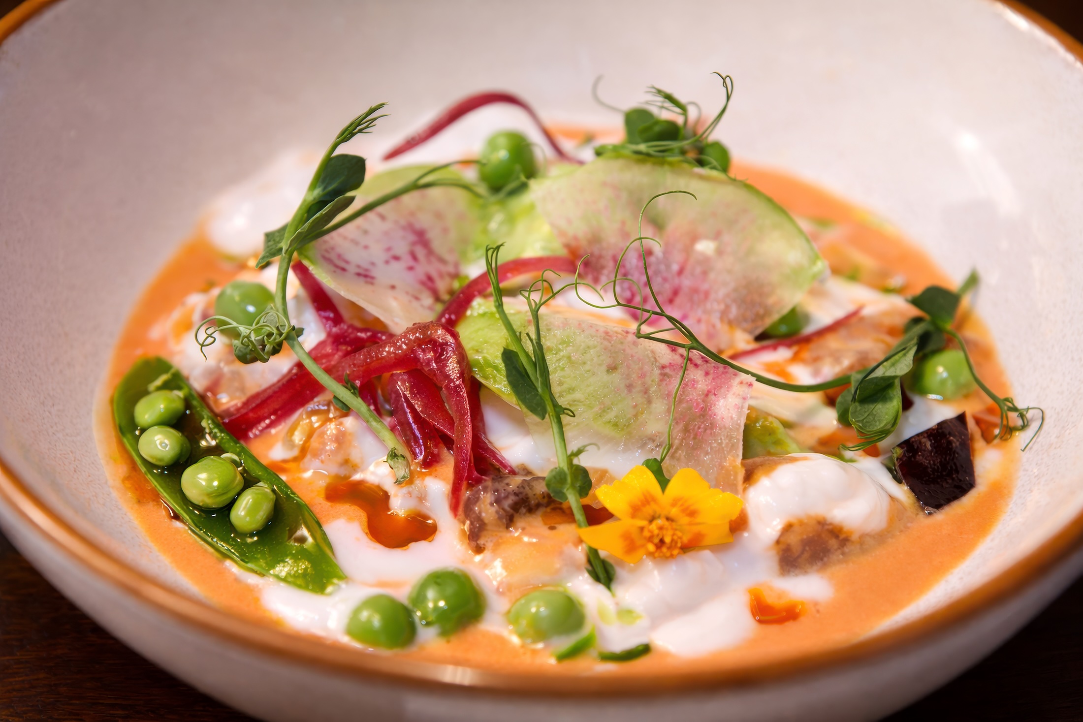 Holding onto some classics while introducing what will unquestionably become new classics, Chef Carlos’s spring menu for 2026 is as colorful and vibrant as the chef himself: Boldly curated with a rainbow palette on each plate—red and yellows bounce against greens and purples—what it showcases is a chef willing to put in the work.