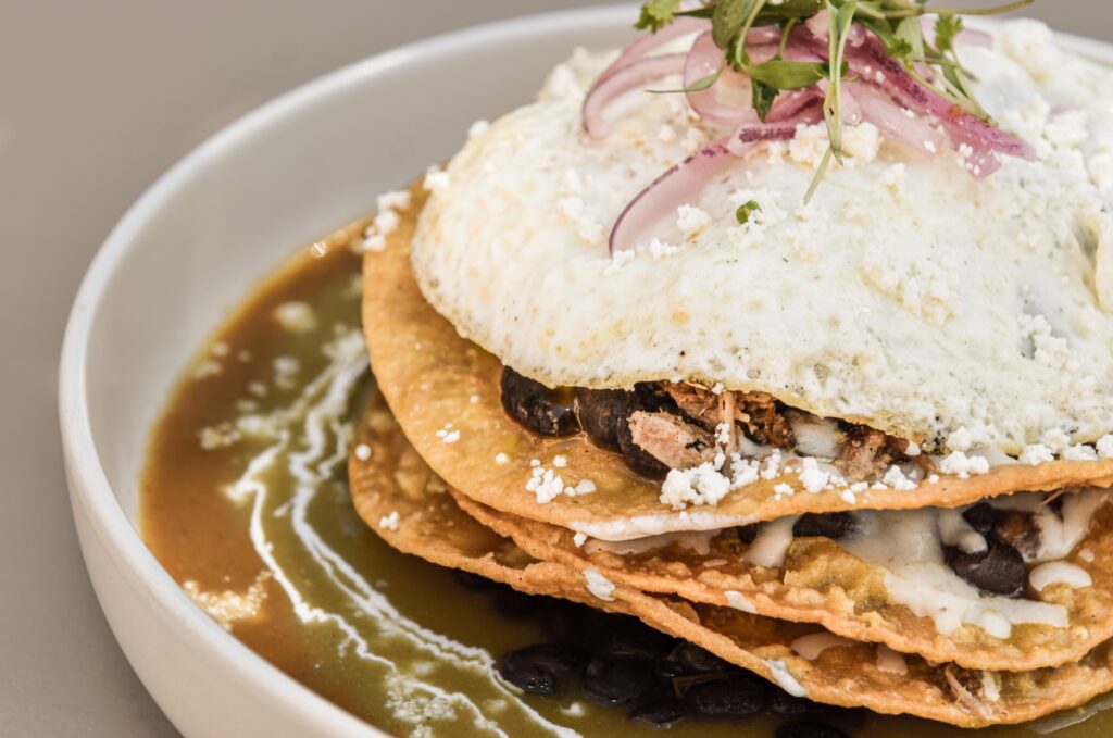 Chilaquile Stack, crispy tortillas | salsa verde | carnitas | cheese | black beans | sour cream | queso fresco | fried egg