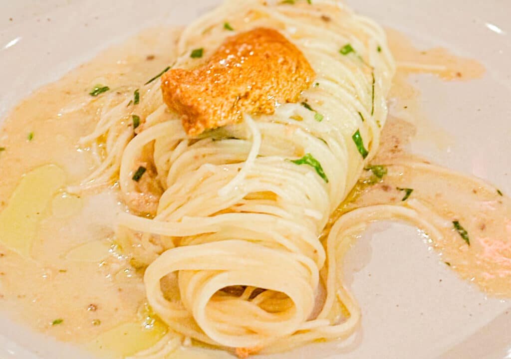 But the stand-out dish—and one I will likely be begging for him to make again—was his angel hair pasta dish. House-made cappellini is doused in a sea urchin pesto of olive oil and bits of basil before being topped with a chunk of pure uni. The result is an umami bomb that is comfortably tucked in a wonderfully full mouth of pasta given just how much cappellini one can wrap around a fork for one bite.