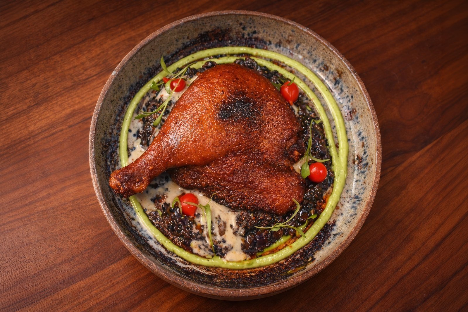 And then the star: A duck thigh that has a three-day preparation behind it. An overnight cure. A one-and-a-half-hour smoke session. Then confit overnight in a sous vide with duck fat and aromatics. That is then fried off to give the perfect outer layer of crisp. A savory and aromatic bomb of a dish that oozes with complexity, finesse, and outright sexiness. Yes, this is a sexy dish—and deserves to be experienced by as many as possible.