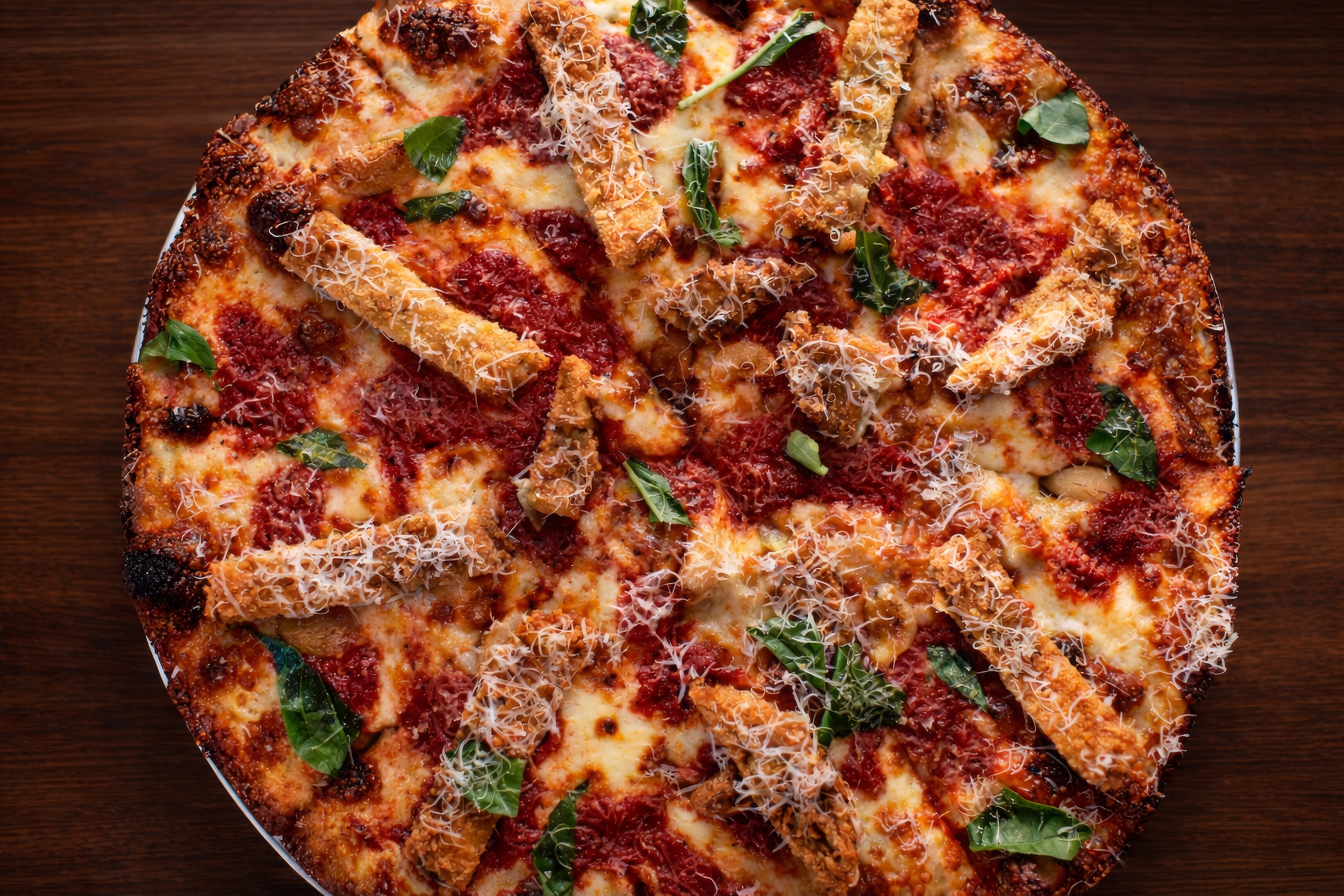 Fried Eggplant Pan Pizza: red sauce | eggplant parmesan | garlic confit | parmesan