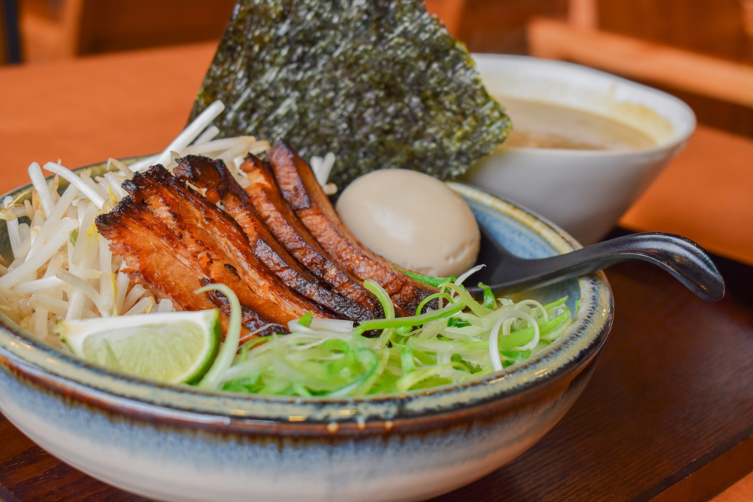 Black Garlic Tonkotsu: Noodle | Chashu | Black garlic oil | Soft-boiled egg | Nori | Bean sprouts | King Oyster mushroom | Bamboo shoot | Green onion