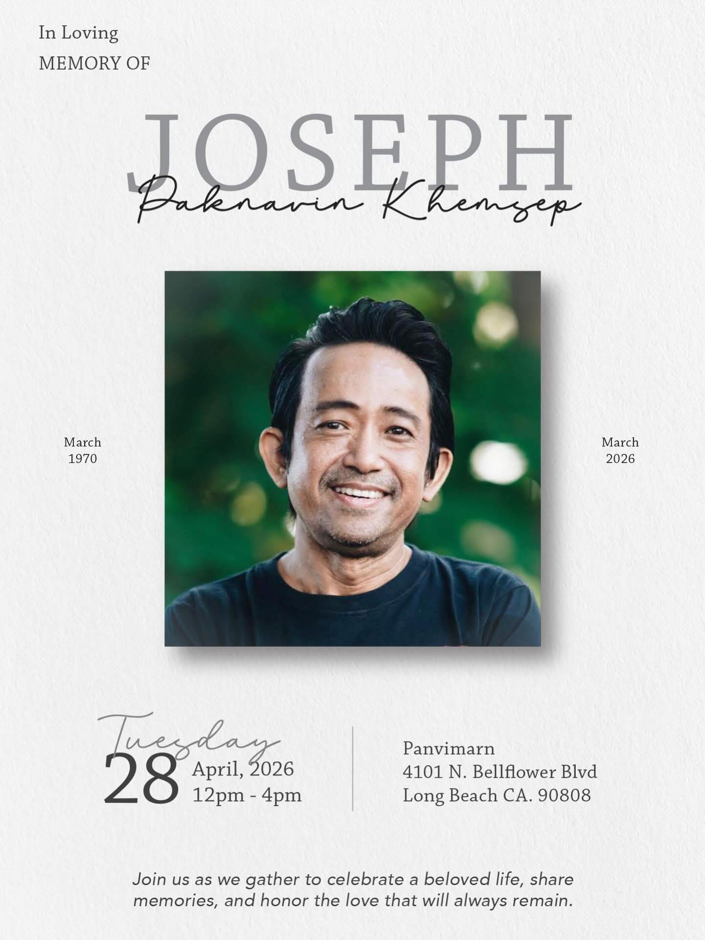 “With heavy hearts, we share the passing of Paknavin Khemsap (Joseph), beloved founder and creator of Panvimarn Thai Cuisine, on March 15, 2026. We warmly invite you to join us in celebrating his life, legacy, and the joy he brought to so many.