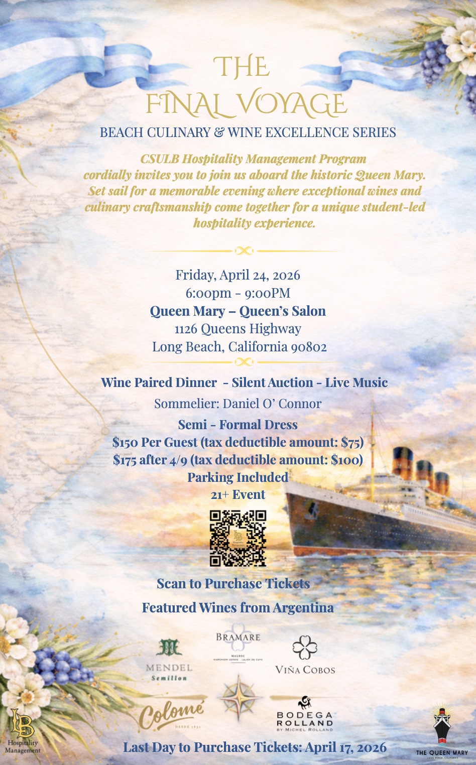 CSULB’s Hospitality Management Program is returning to the Queen Mary for its Wine & Culinary Excellence Dinner, inspired by wines from Argentina.