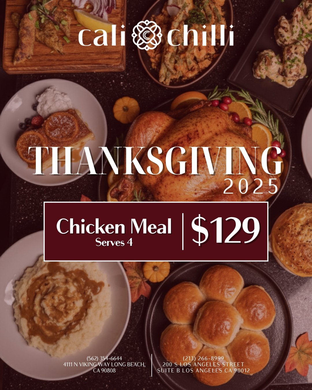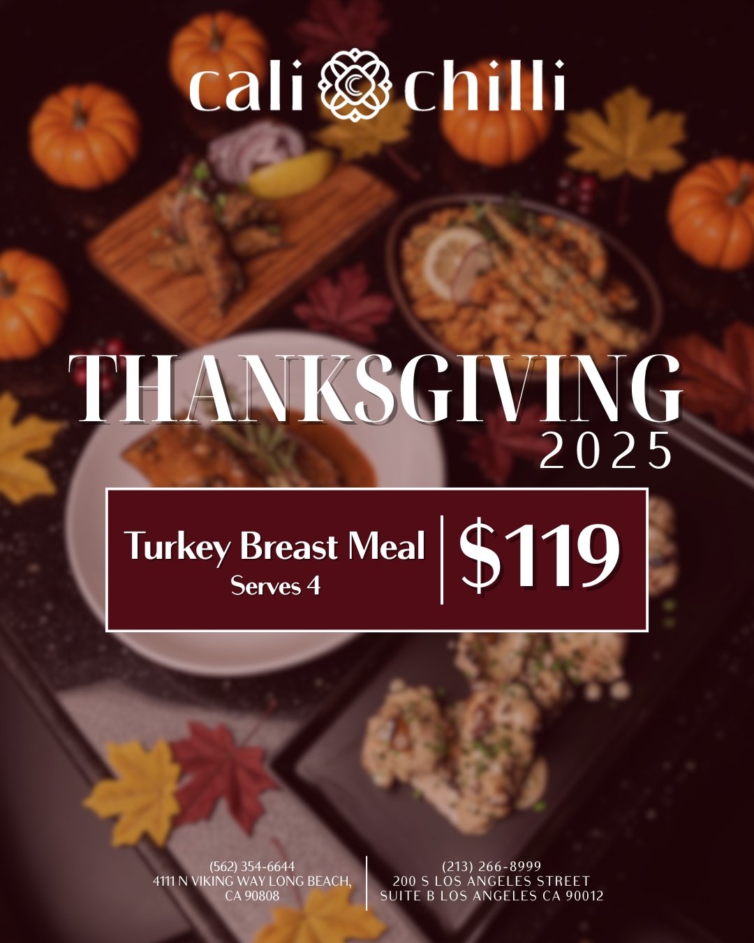 What time? Breakfast: 7:30AM to 11AM; Lunch: Noon to 2:30; and dinner 5PM to 9:30PM. What to expect? Their brunch, lunch, and dinner menus along with full family dinners to-go, one with turkey and another with chicken. Even better? Members of the Long Beach Food Scene will receive 10% off.