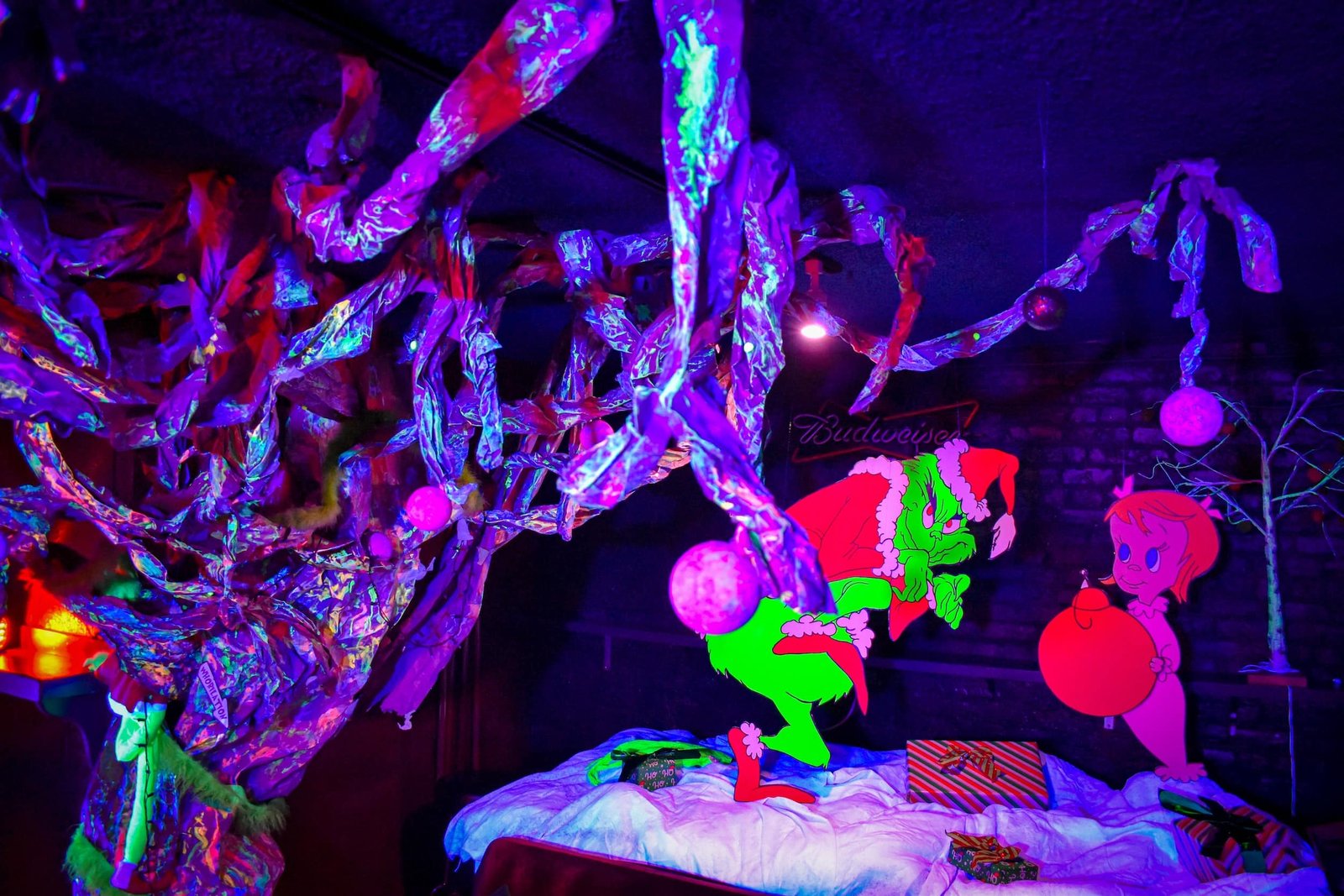 Unlike the generic Christmas motif that often overcomes spaces during the holidays, this is all-out Grinch’n’green. You can write letters to the Grinch at their mail station. You can find Grinch gobos projected onto walls while Baby Grinch floats in his Pumbersella above the dance floor. A fully decked-out dark ride section… And, of course, drinks.