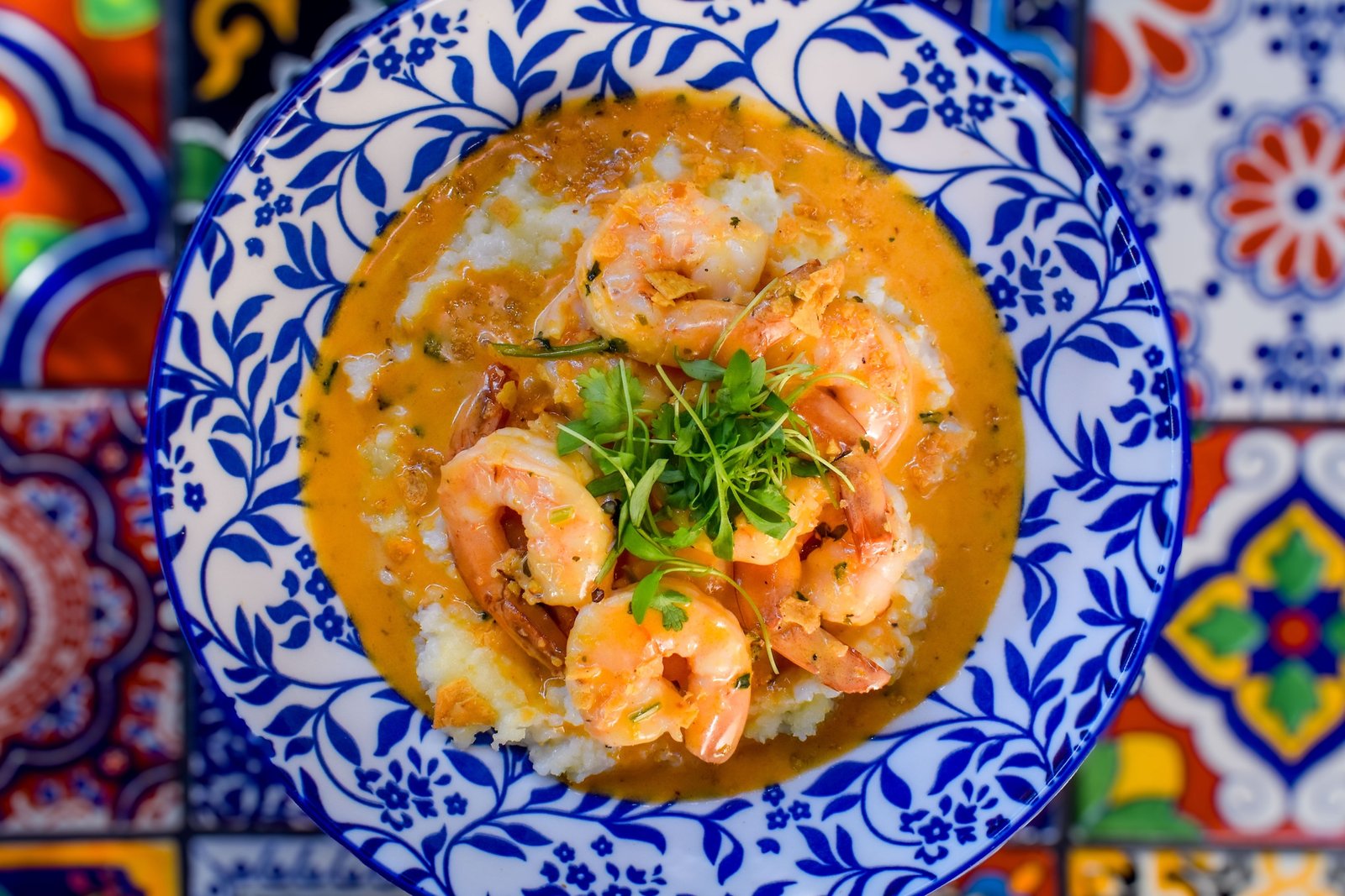 Shrimp & Grits: Roasted Tomato Broth | Hominy Grits | Crema | Lardons