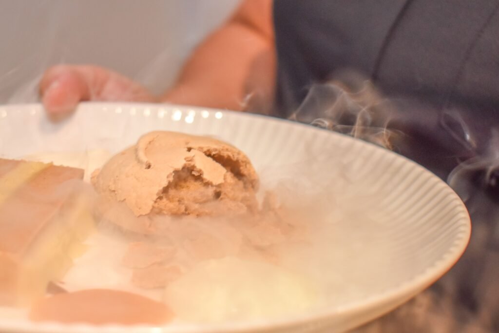“But of course, we couldn’t stop there,” Chef Max said, laughing. “There will be a vase of cereal milk coffee base in the center of your table. Now this vase of cereal milk coffee is pretty unassuming… Until we drop a chunk of dry ice into it. This coffee traps smoke from dry ice in bubbles that are edible and taste like coffee. Guests are encouraged to play with their food on the last course and dig their spoon into this overflowing coffee bubble vase to enjoy them with the other components in the bowl.”