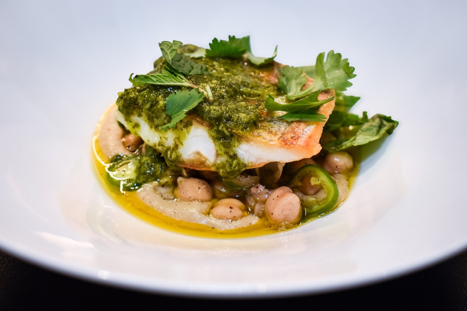 Sea bass: foie gras hummus | chickpeas | zhoug