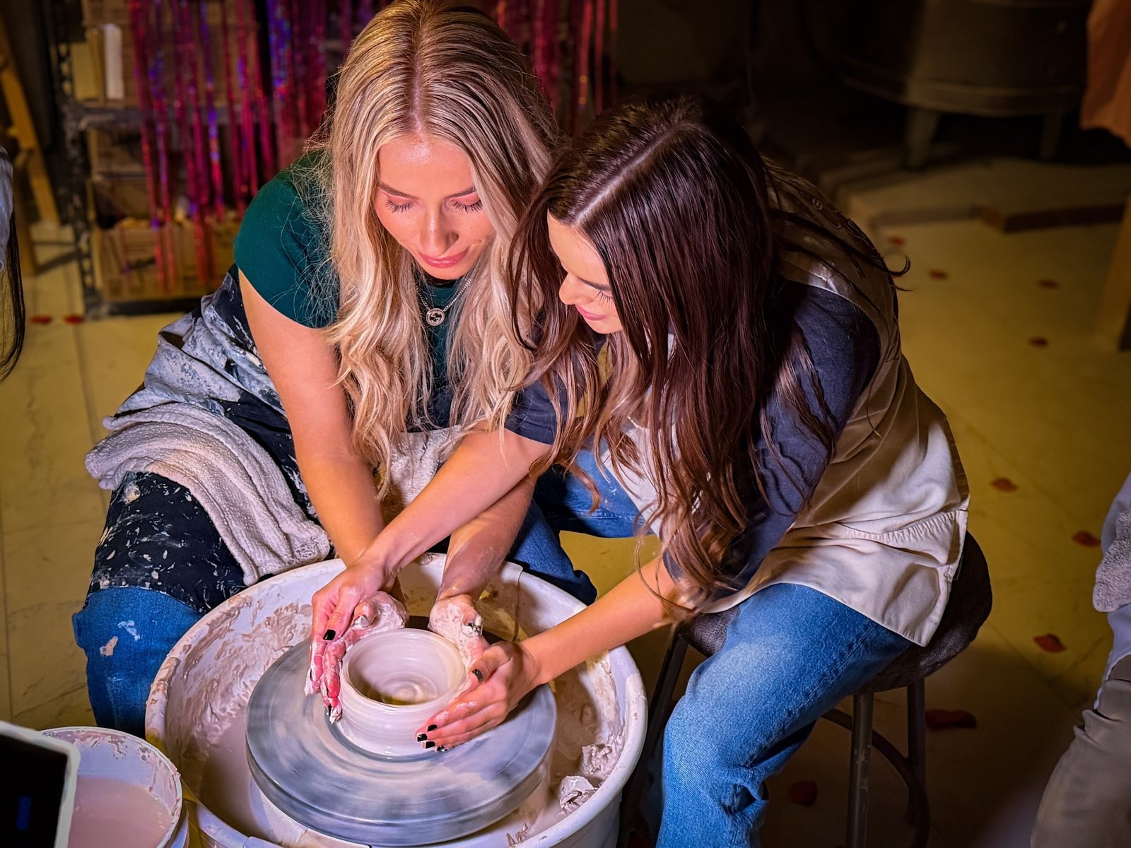 You get three rounds at the wheel, all under the patient eye of a Clay on First instructor. Throughout, feel free to get up for another drink. Let go of the wheel to watch your partner go at it independently. Take turns. The wheel is your oyster—but you need to make those three times count.