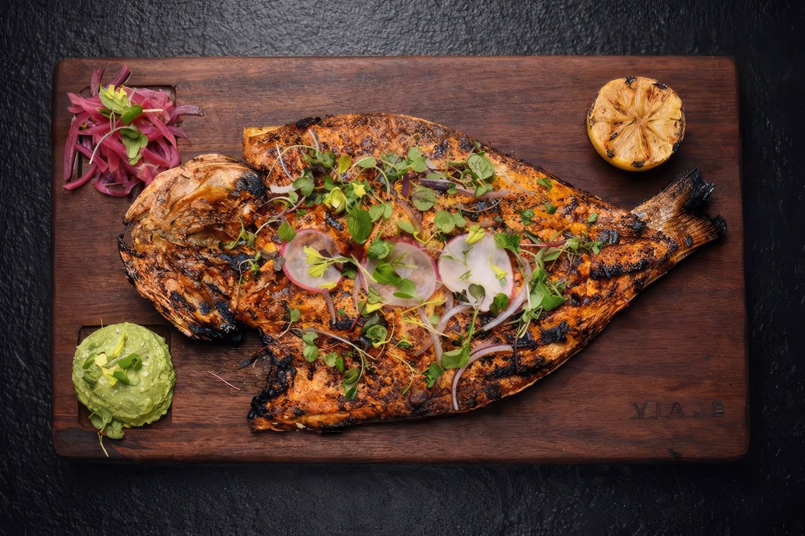 Pescado zarandeado: branzino | axiote | chile guajillo | guacamole